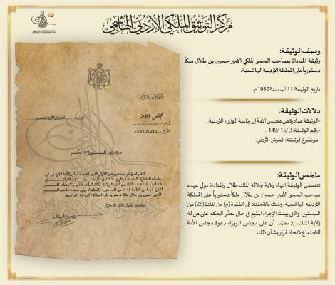 التوثيق الملكي يعرض وثيقة المناداة بالأمير الحسين بن طلال ملكا دستوريا