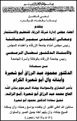 الزرقاء للتعليم والاستثمار تنعى شقيق الدكتور محمود ابو شعيرة