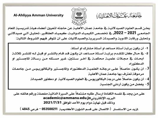 قسم العلوم الصيدلانية في عمان الأهلية يعلن عن حاجته لتعيين أعضاء هيئة تدريسية
