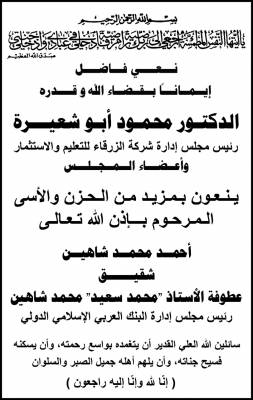 جامعة الزرقاء ينعون المرحوم أحمد شاهين شقيـق "محمد سعيد" شاهين رئيس مجلس إدارة البنك العربي الإسلامي الدولي