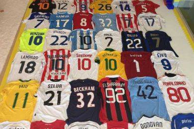صور.. نجم برشلونة يتباهي بكنز قمصان نجوم العالم على سريره
