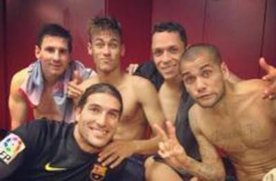 بالصور.. هكذا احتفل نجوم برشلونة في غرفة خلع الملابس
